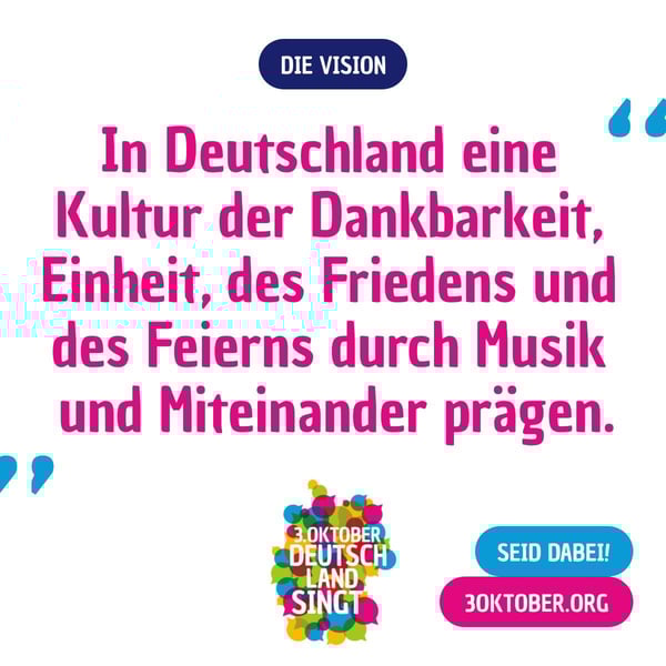 Oktober Deutschland singt an über 260 Orten eine musikalische DANKE-Demo. Oktober Deutschland singt Einheit Freiheit Hoffnung. Dabei handelt es sich um eine bundesweite musikalische Danke-Demo die am Tag der deutschen Einheit als Zeichen der Hoffnung und Dankbarkeit für über 75 Jahre Frieden in Deutschland zu verstehen ist.